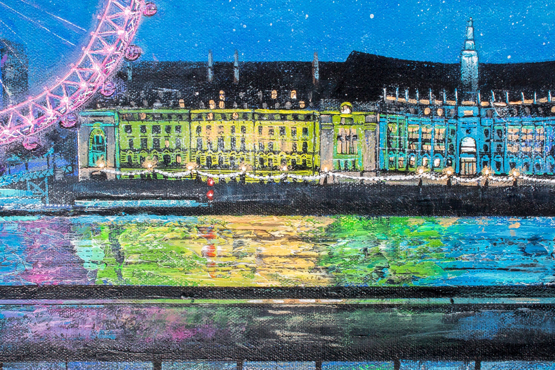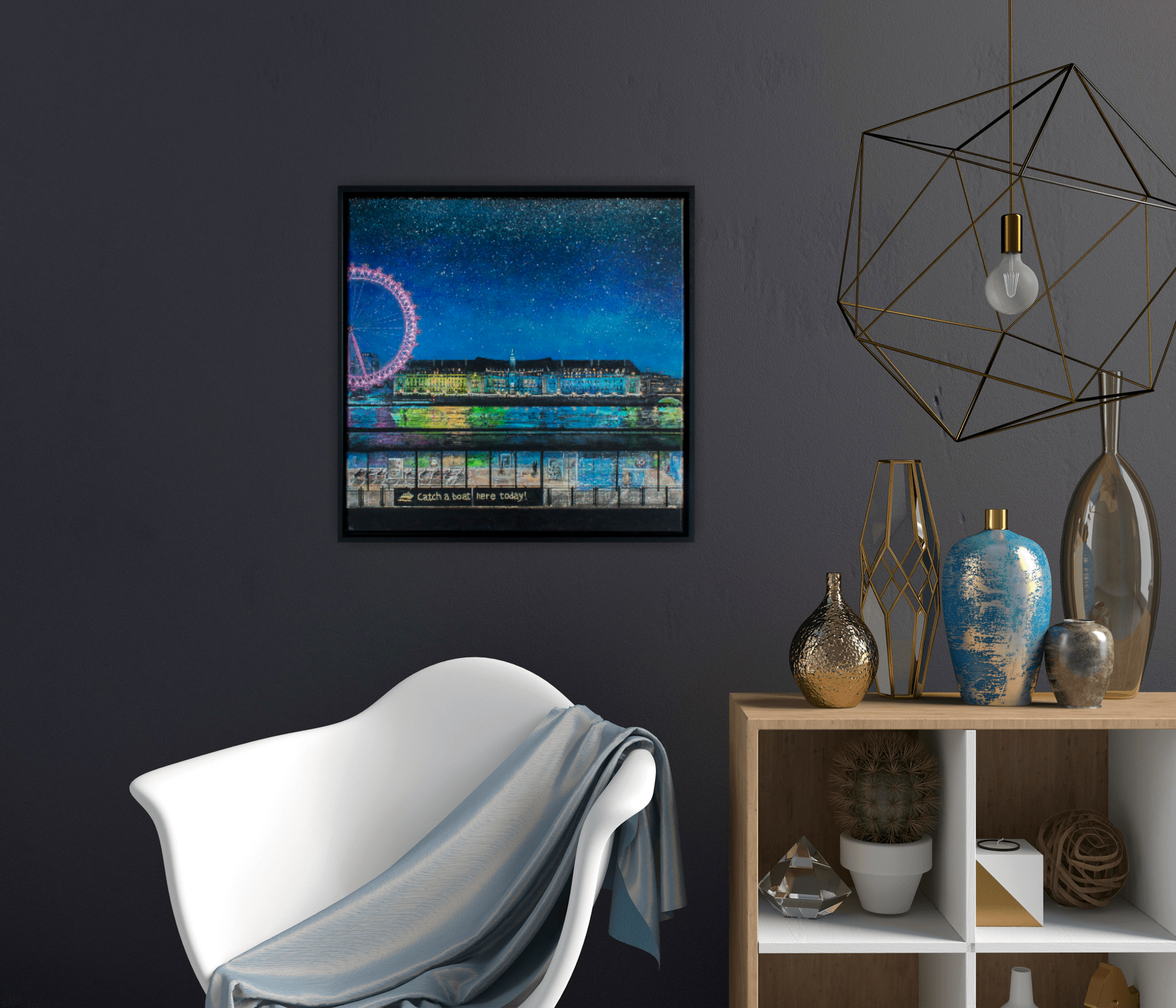 The modern architecture and colourful lights of County Hall on South Bank stretch across the canvas; the rainbow of colours mirrored in the river Thames and the glass of Westminster Pier in the foreground. The London Eye glows as the final passengers of the day go for a ‘spin’ on the great wheel. Quiet footsteps echo along the pier as the occasional passenger arrives for an evening trip on the Thames Clippers. The night feels calm and timeless; the stars twinkle serenely above and the viewer can pause for an uninterrupted moment and enjoy the visual plethora of shapes, textures and colours of London.