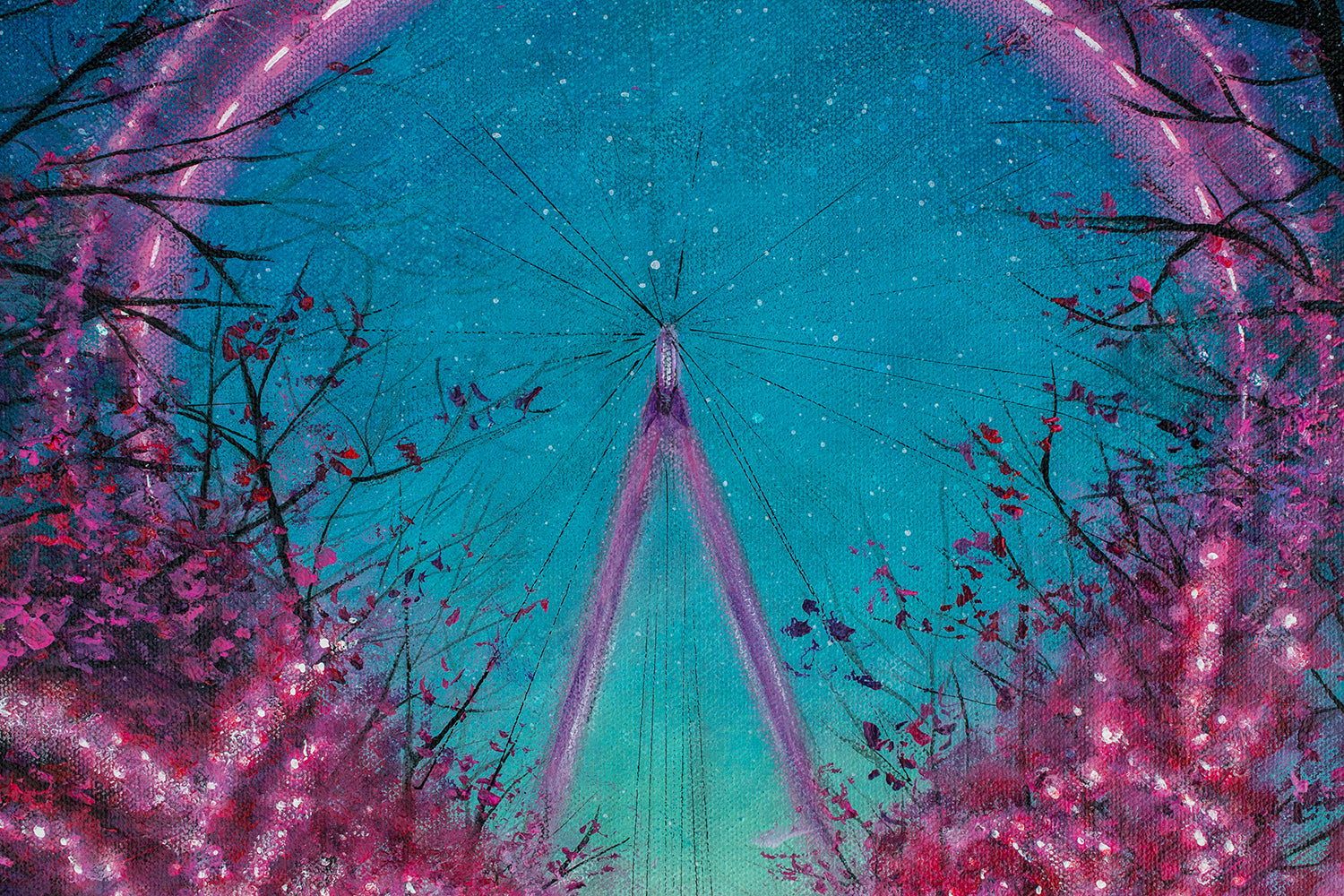 Against the darkening sky, you are guided along a glowing path of fairy-lit trees toward the central star of the scene: the London Eye. The vibrant pink threads through the composition, pulling the viewer’s eye through the frame, from the shimmering lights on the trees, reflecting in the path and surrounding buildings, through to the towering wheel itself.