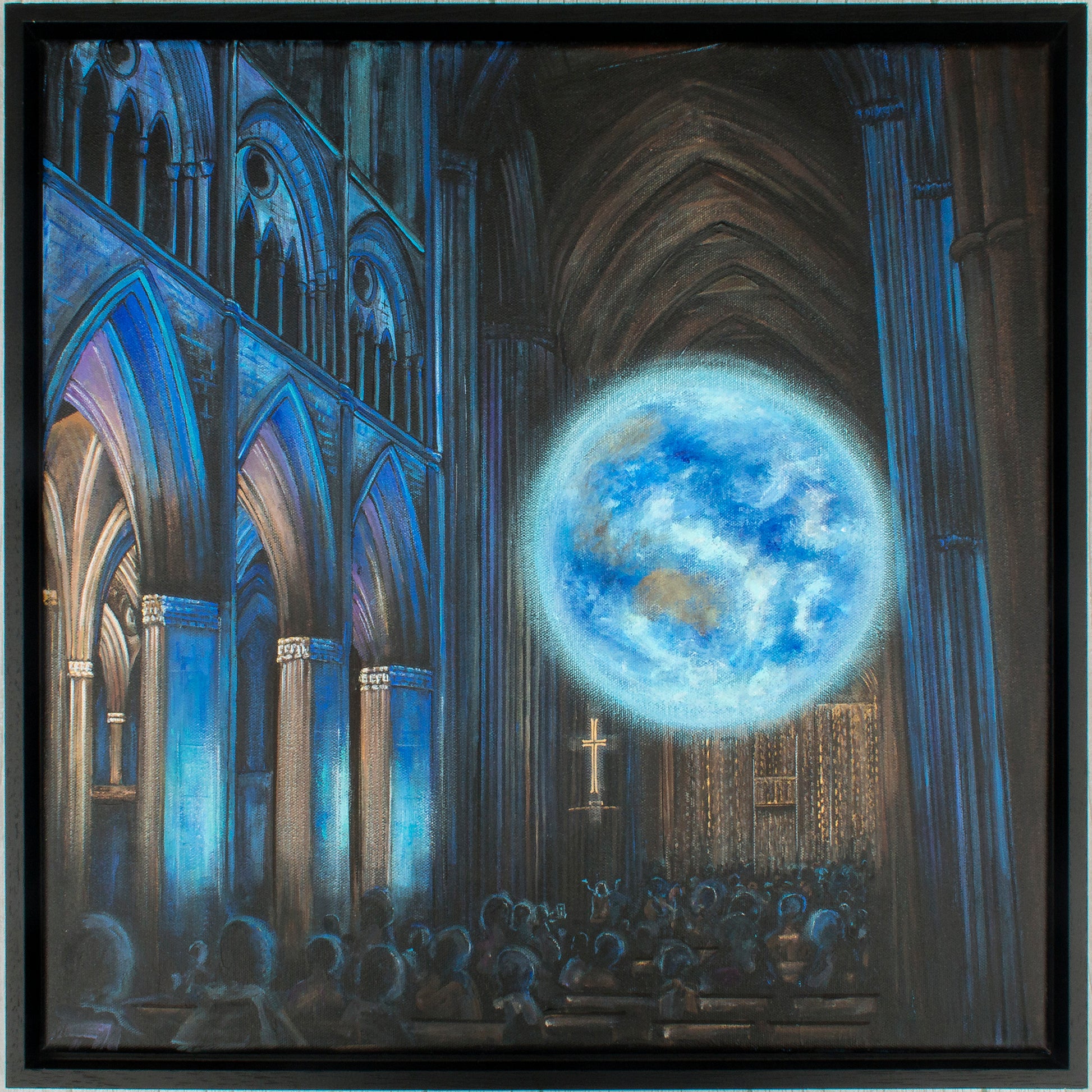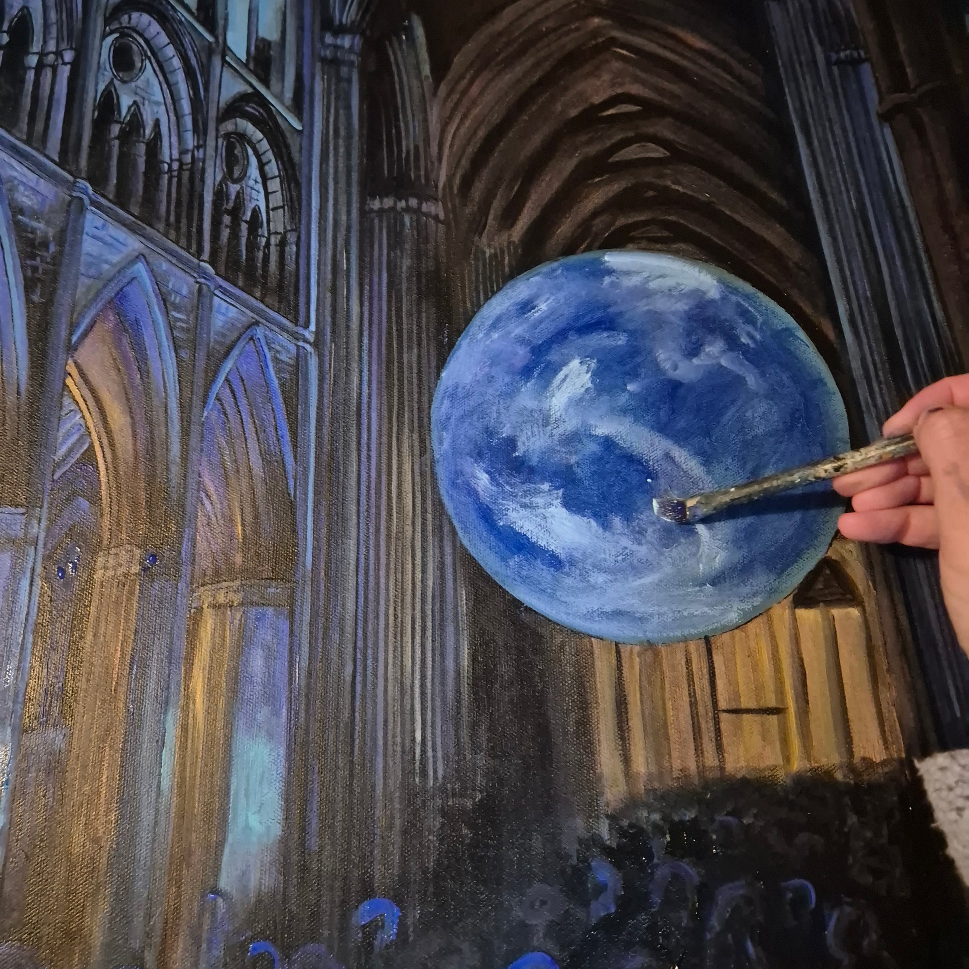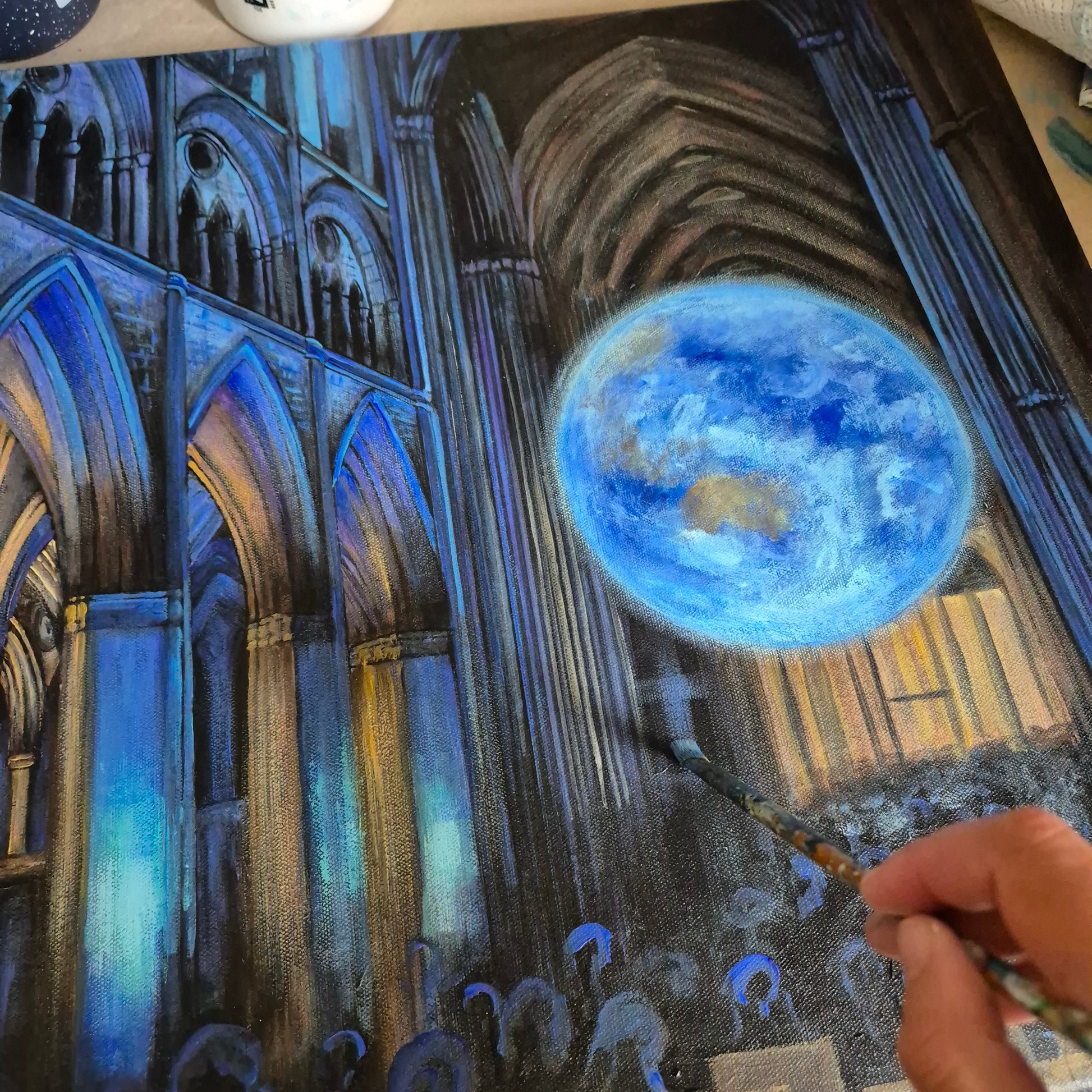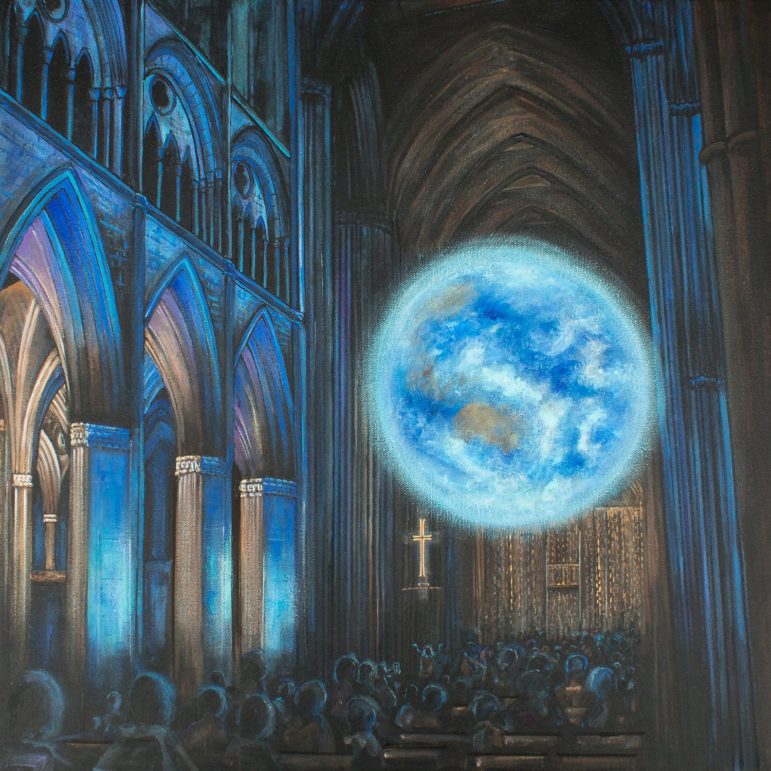 This painting is based on a visit to Truro Cathedral, back in 2023, to see the Gaia installation. There was something about the huge earth hanging suspended within the gothic arches of the cathedral which really caught my attention. The clash between the tall arches, subtlety lit in blue, against the vision of the world pulling focus.