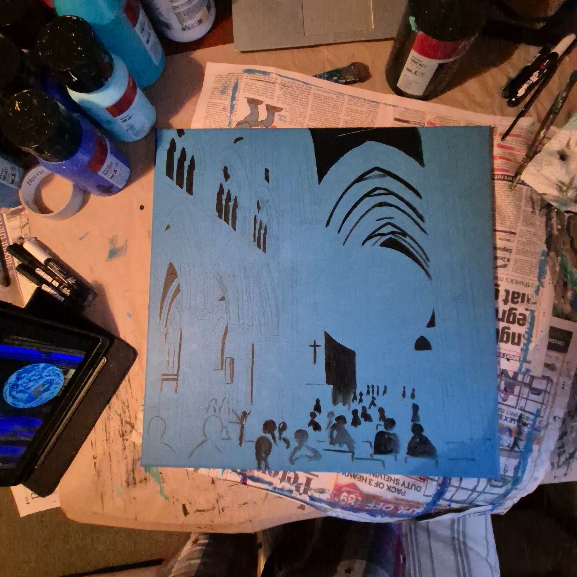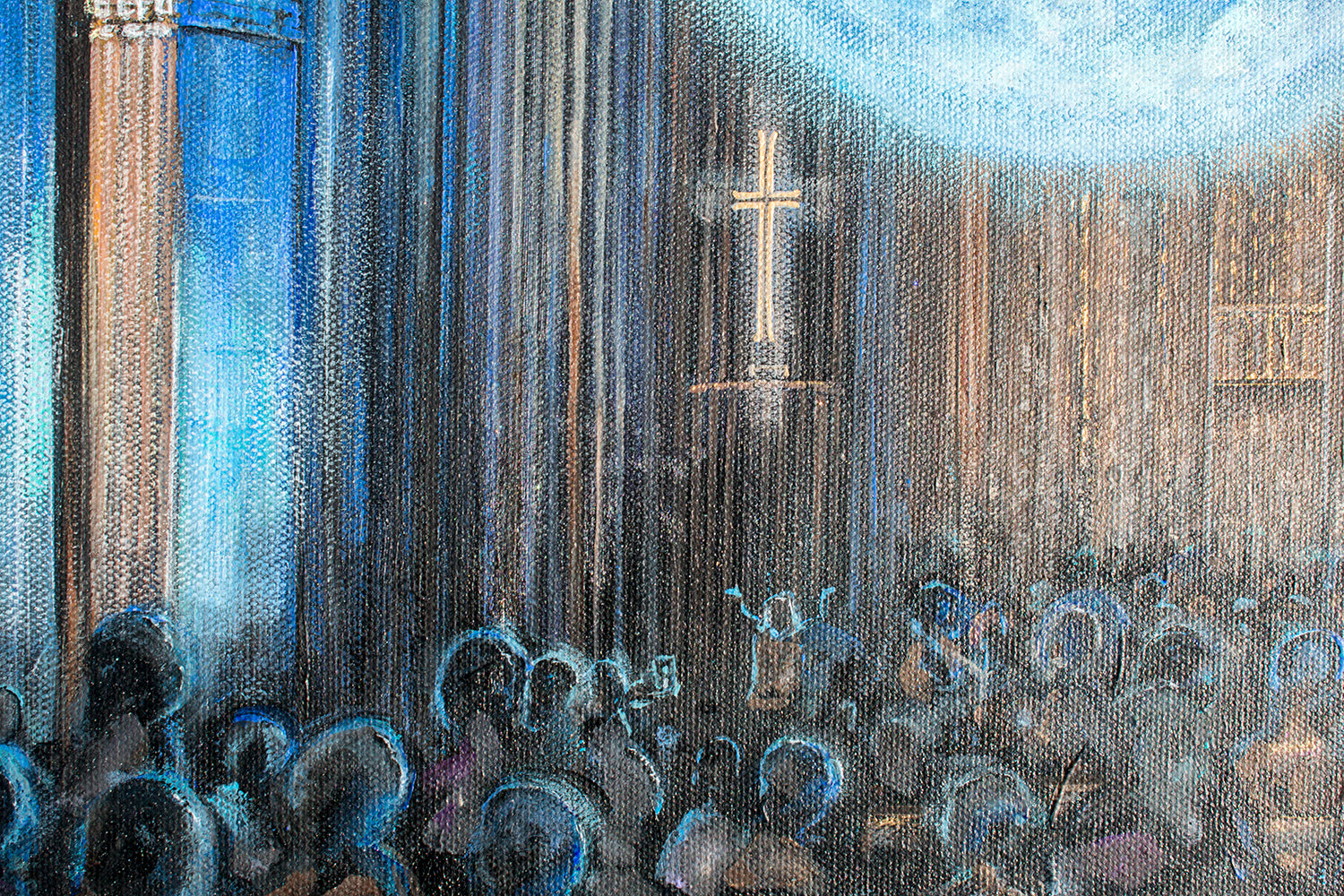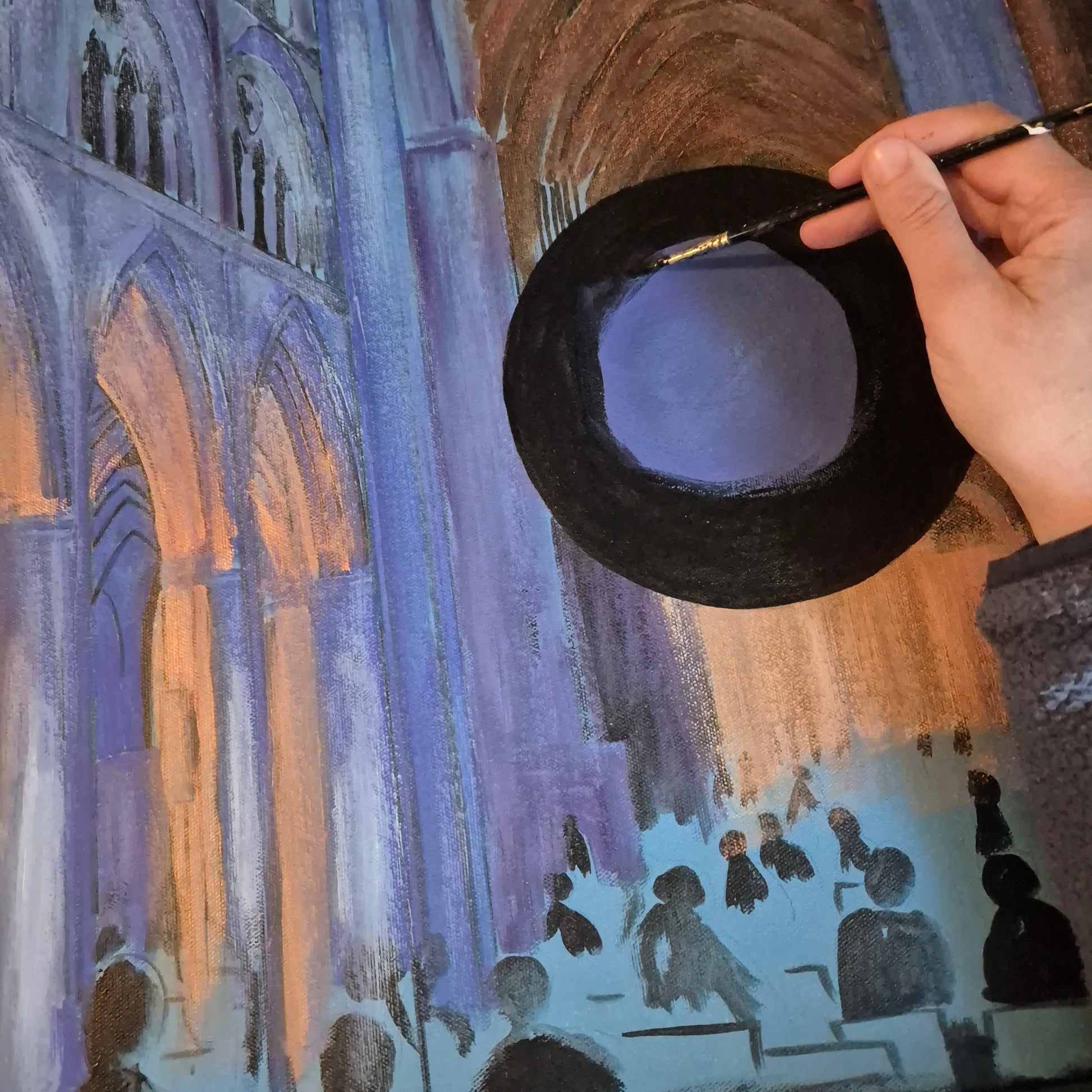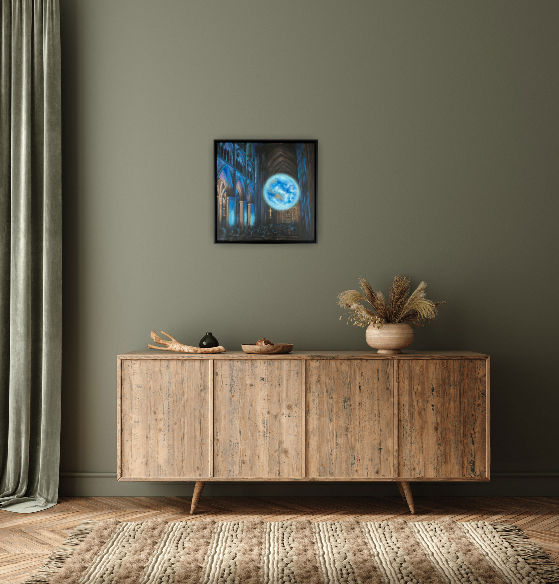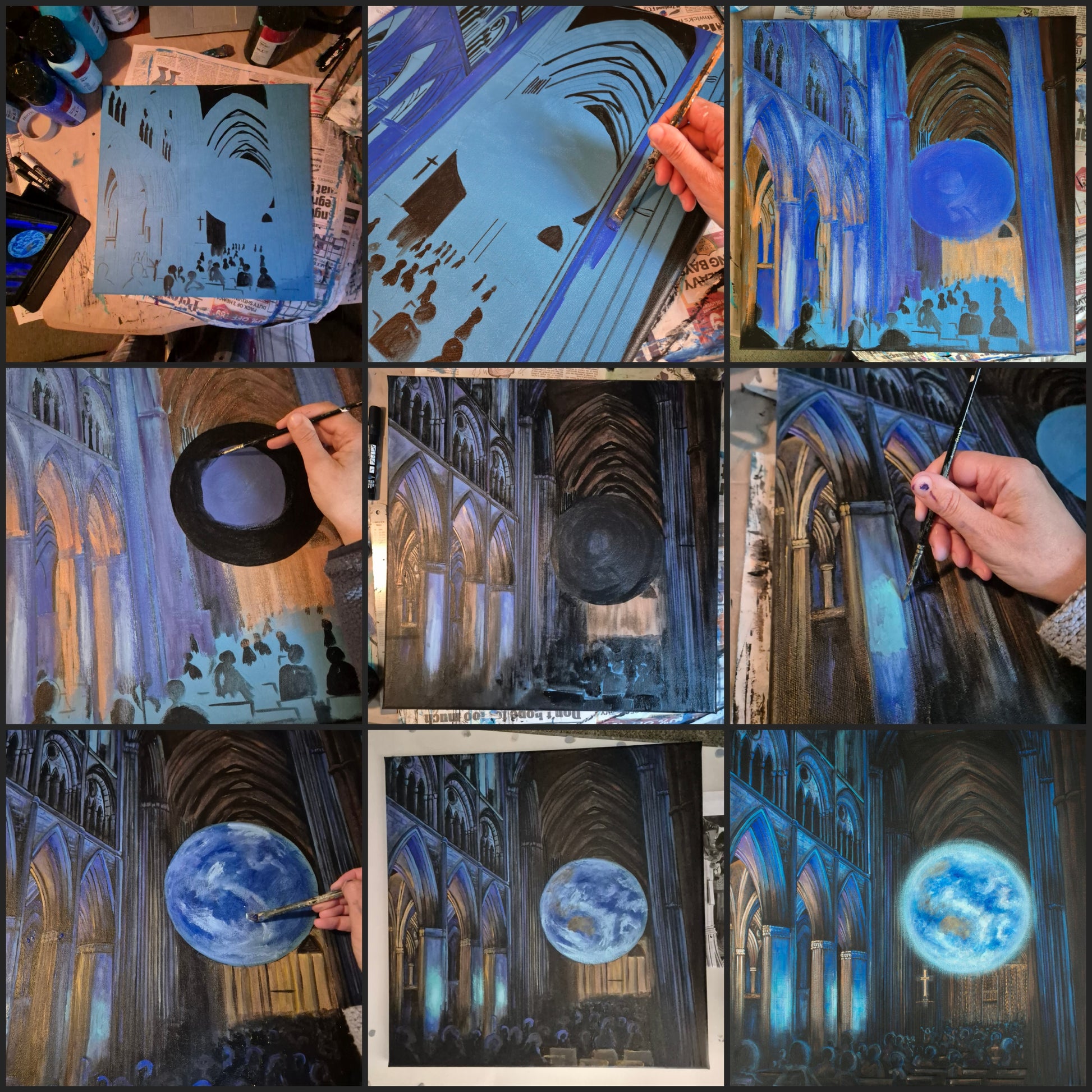This painting is based on a visit to Truro Cathedral, back in 2023, to see the Gaia installation. There was something about the huge earth hanging suspended within the gothic arches of the cathedral which really caught my attention. The clash between the tall arches, subtlety lit in blue, against the vision of the world pulling focus.