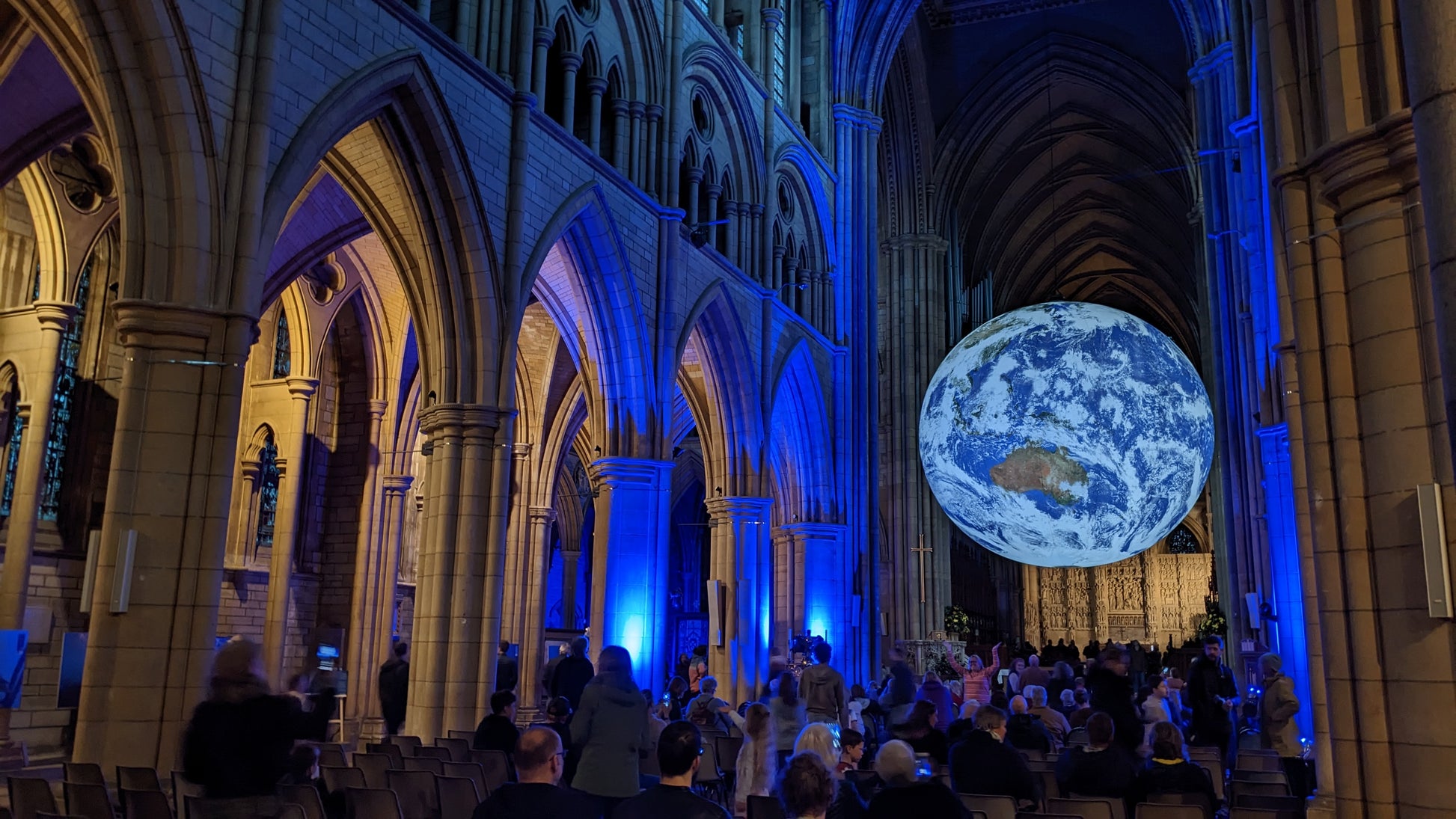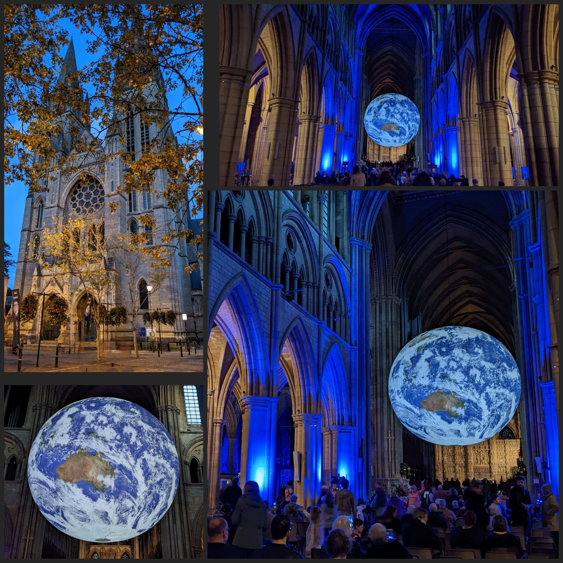 The phrase “It’s a small world,” spoken lightly in everyday conversation, takes on new meaning as we see the illuminated Gaia installation framed within Truro Cathedral.