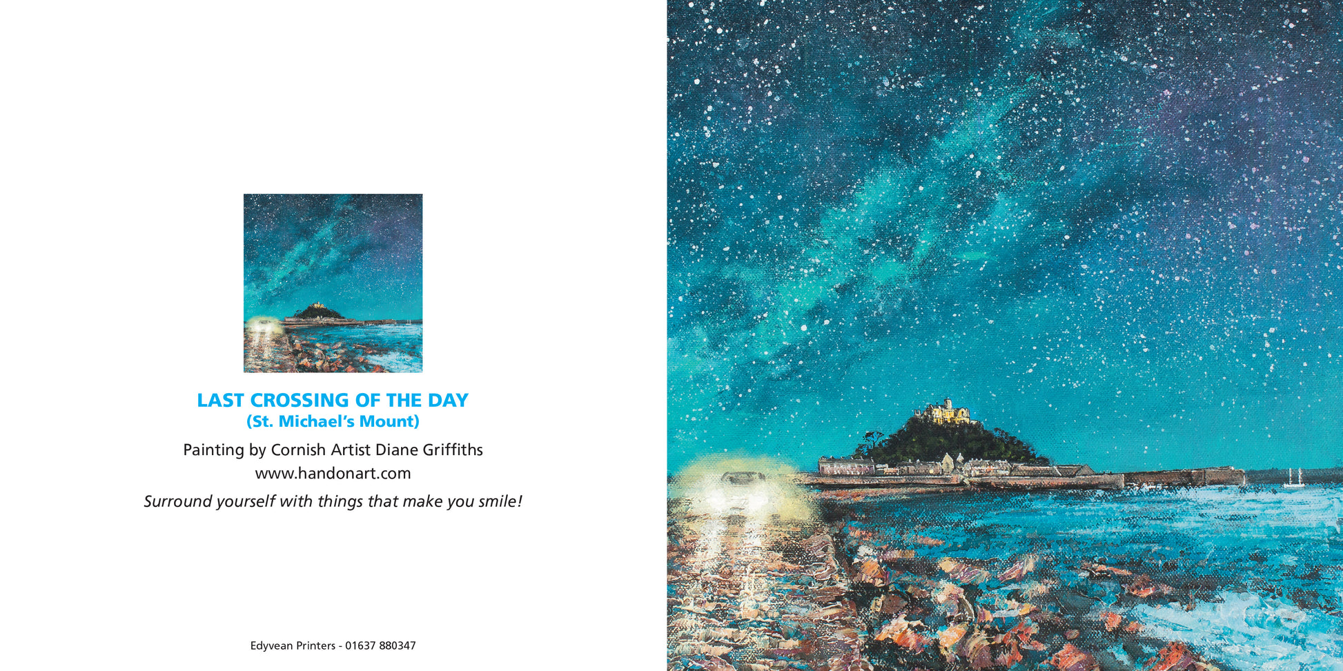 A night time painting of St Michael’s Mount with the last truck of the day leaving the Mount on the causeway. The quiet power of the castle, towering above the sea in its timeless, enigmatic beauty is lit by warm lights; their stone walls reflecting the glow, creating a contrast against the starry sky above and dark waters below. The causeway stretches out, a thin ribbon of stone connecting the island to the mainland, its surface slick and reflective from the evening tide, the headlights bouncing off the cobblestones. It’s nearly time for me to move out of the way to let it pass, but I have a few seconds longer to enjoy the scene.
