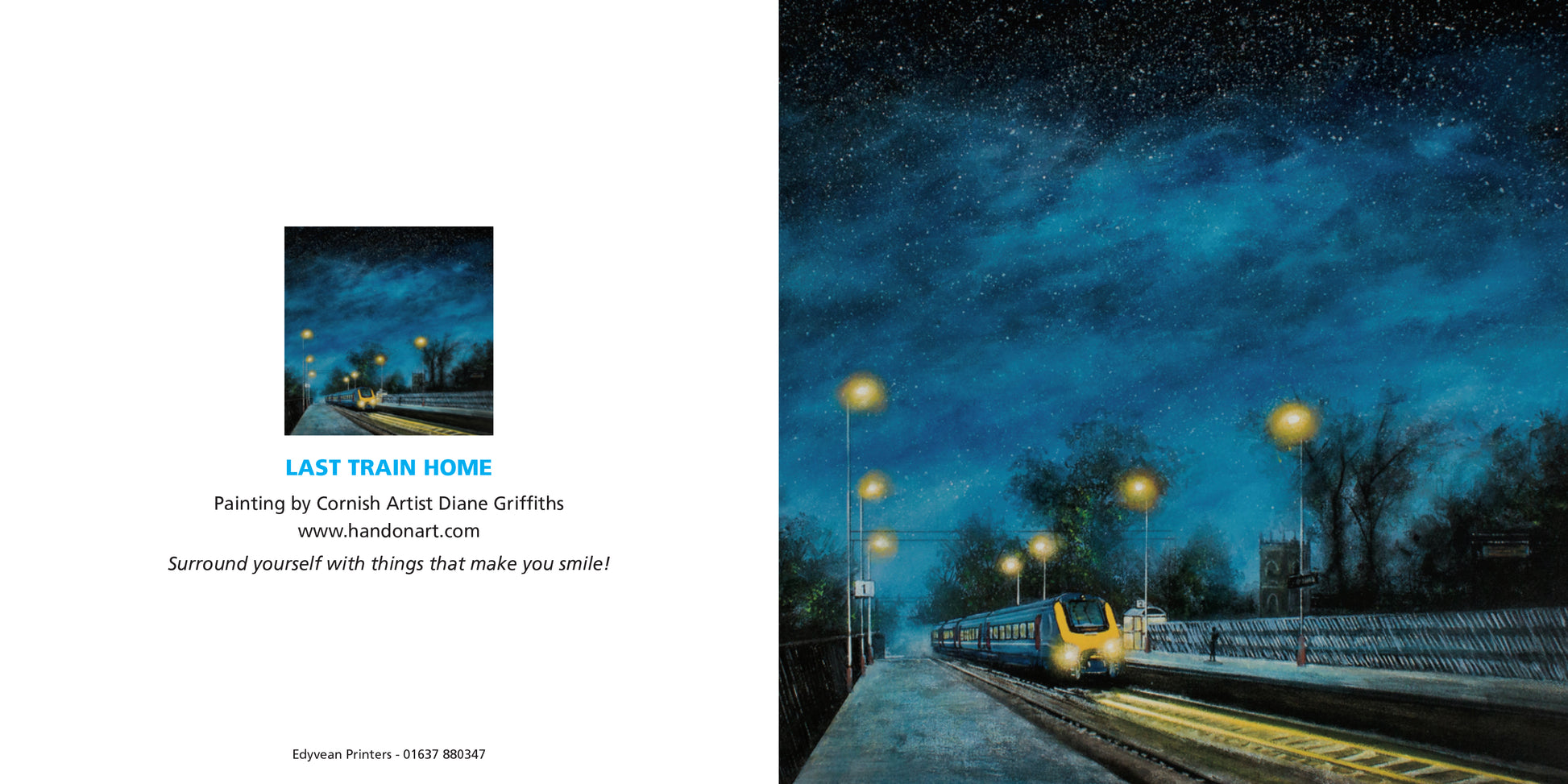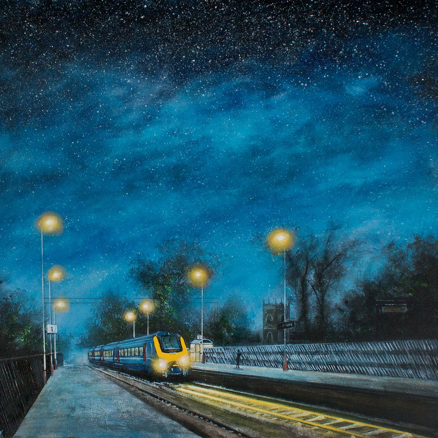 Set beneath a wide, dark sky, Last Train Home captures the solitude of a rural train station at night. The figure on the platform stands ready and waiting, their eyes fixed on the approaching train, its headlights piercing the darkness. This painting captures that relief when the last train of the night pulls into the station, a welcome beacon offering a safe journey home, the promise of arrival, rest, and belonging.
