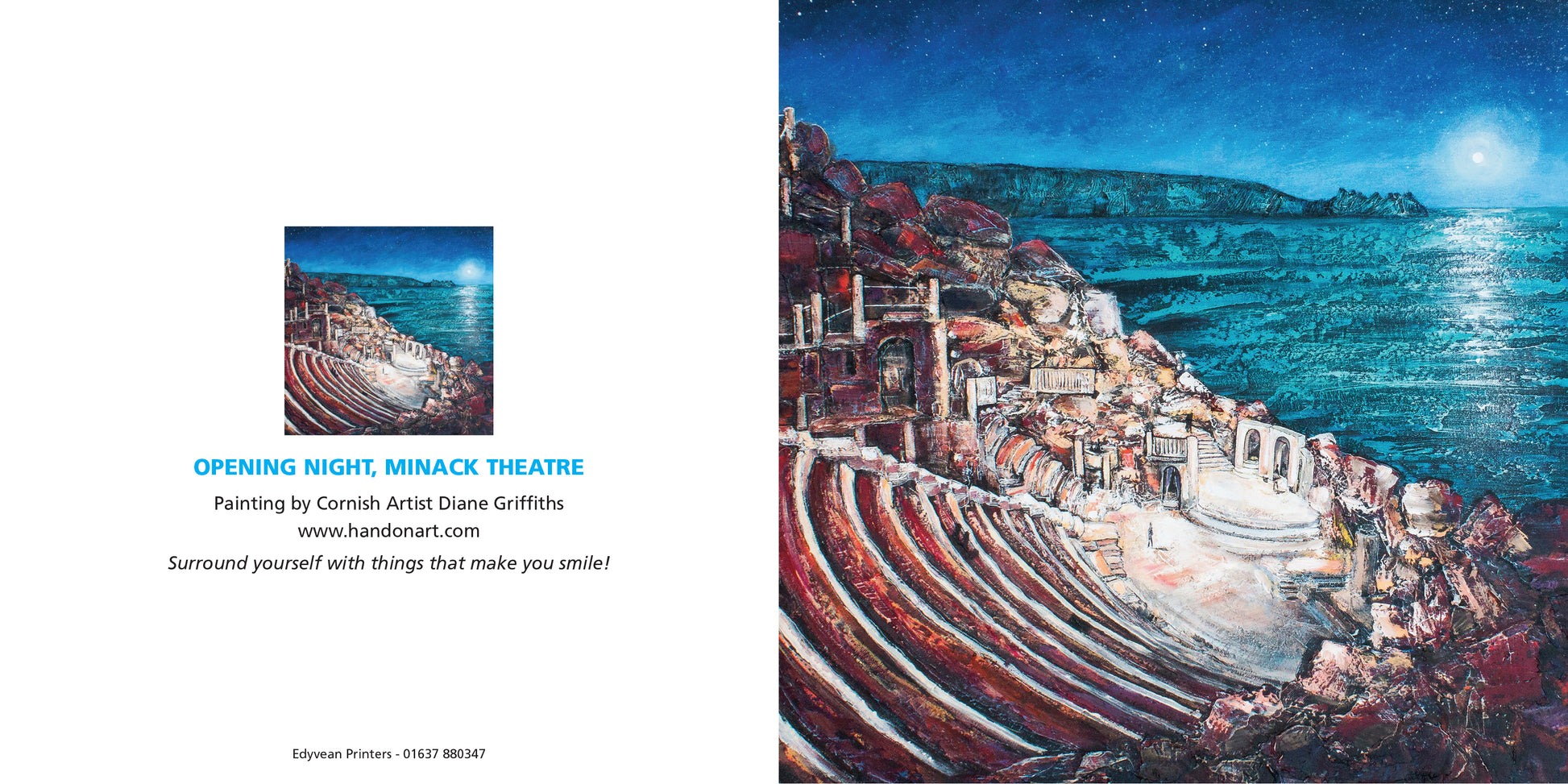 Perched dramatically on the Cornish cliffs The Minack Theatre is almost ready for curtain call. The stage is bathed in a soft light, a few actors and stagehands make final preparations, adjusting scenery or rehearsing lines in hushed voices. The stone terraces, carved into the cliffside, are empty at the moment, but full of promise for the eager audience about to arrive. Beyond the theatre, the ocean glistens under the moonlit sky, waves rolling gently against the rocks below with Logan rock on the horizon. A few scattered stars begin to appear, promising a magical night under the open sky. The atmosphere is one of quiet anticipation, where history, nature, and art blend seamlessly in this one-of-a-kind setting.
