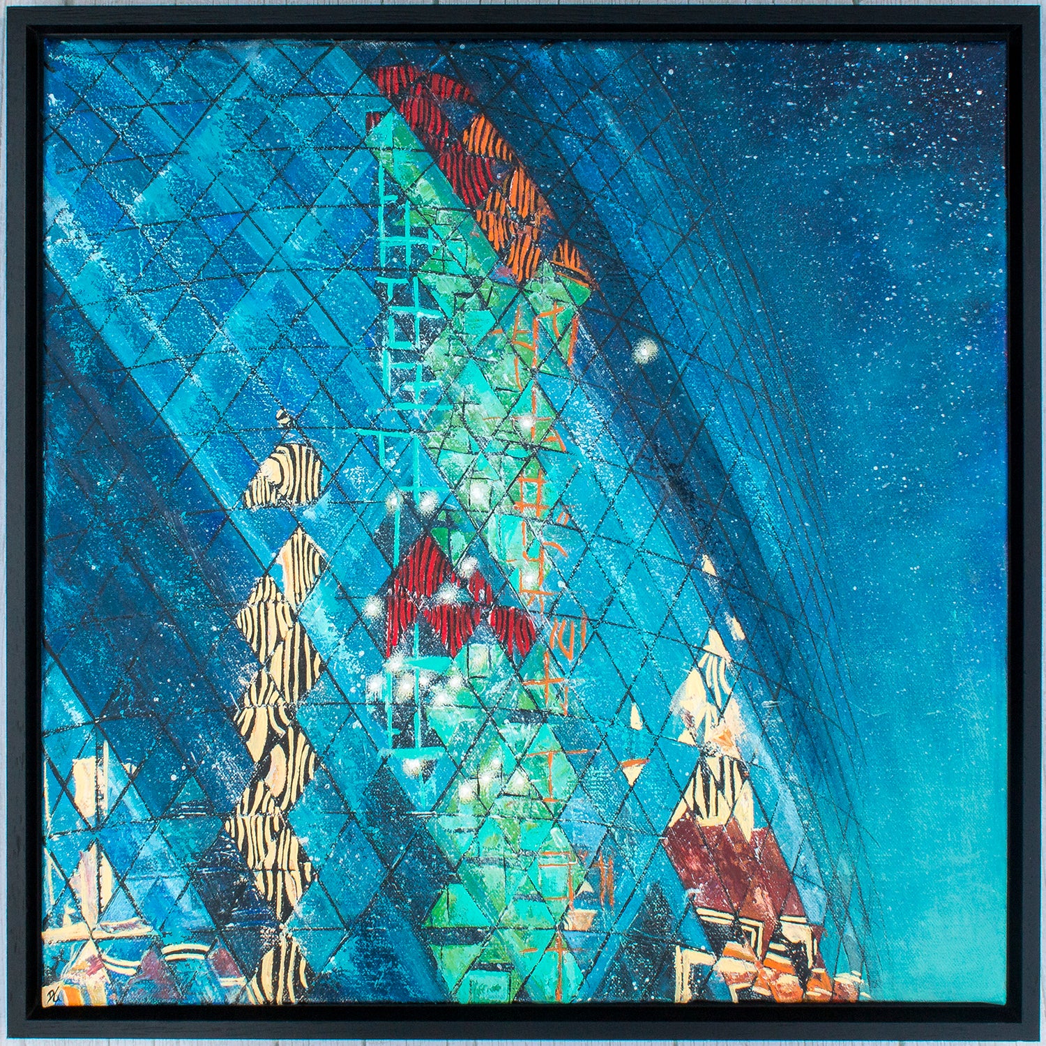 This night time painting captures a striking detail of The Gherkin, London's iconic skyscraper, transformed into a stage for an urban symphony. The building's patterned glassy surface reflects a mosaic of city lights, all shimmering in fragmented patterns across its curved façade. It evokes a sense of stillness and movement simultaneously. Each reflection feels deliberate, like notes in a composition, orchestrated not by human hands but by light. The geometry of The Gherkin warps and refracts the surrounding buildings into abstract forms, creating a visual rhythm made up of abstract patterns in a blend of architecture and illumination.