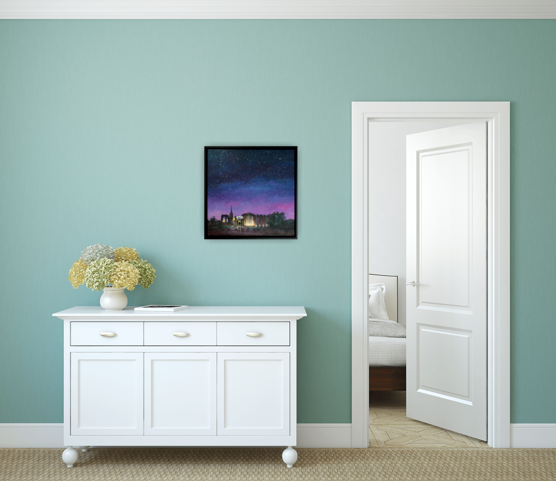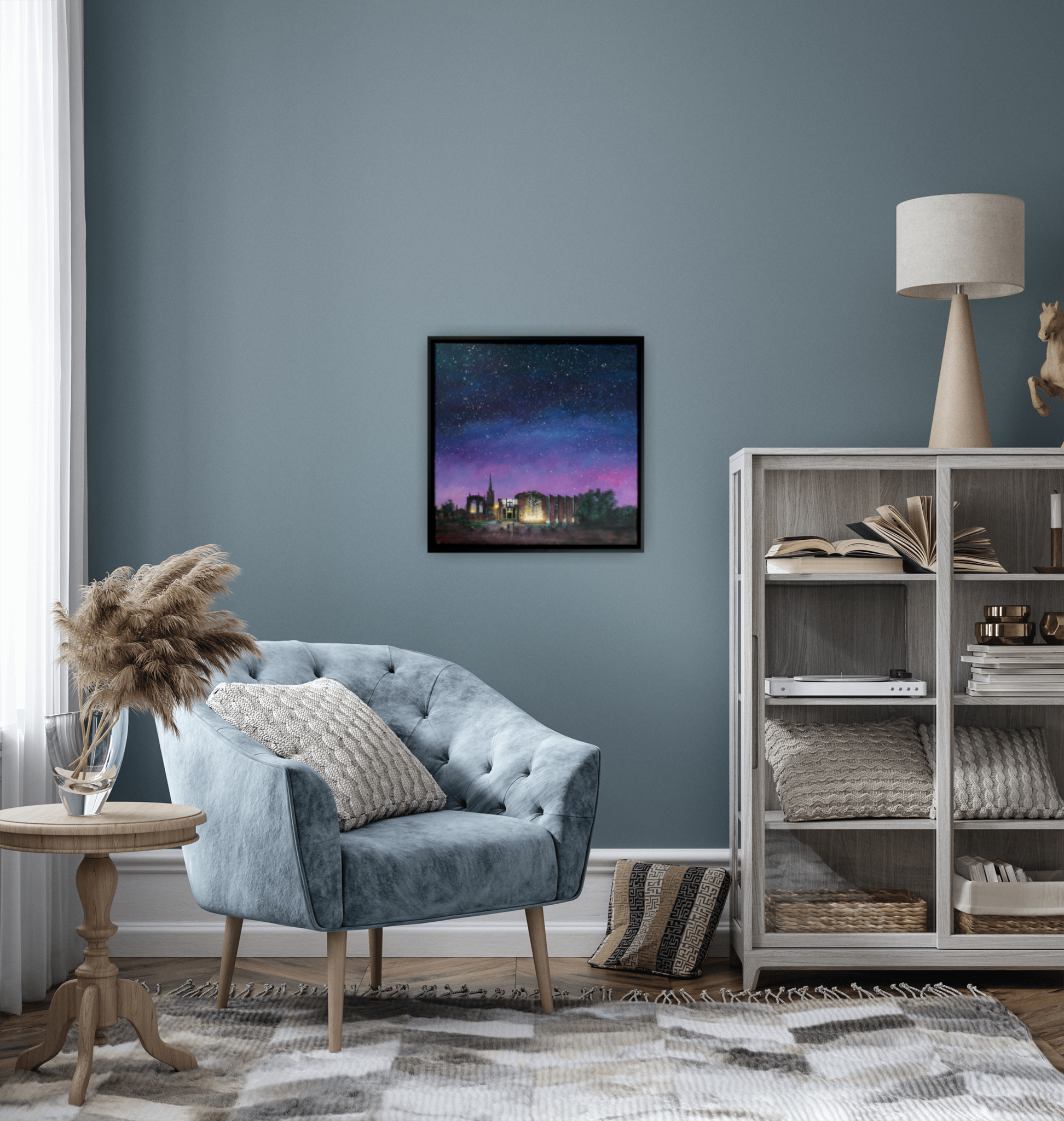 "Sent to Coventry" is a striking painting that captures the ethereal beauty of Coventry Cathedrals under a blanket of night. On the left we have the old Cathedral, rising from the ruins of war, bathed and silhouetted in the soft, ethereal glow of a couple of streetlights. To the right is the stark and stunning modernity of the newer Cathedral, built as a symbol of honour and homage to our scars, a symbol of reconciliation and peace.