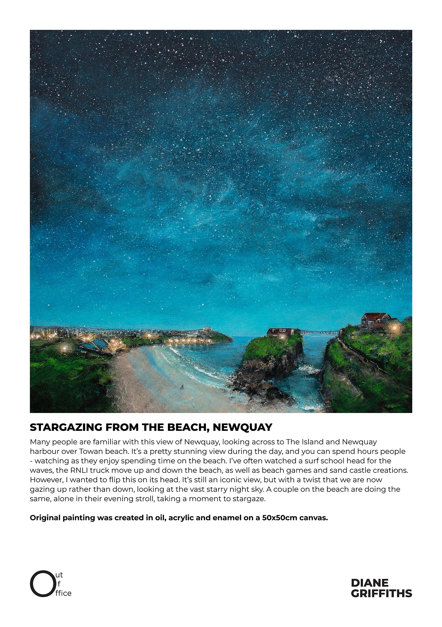 Many people are familiar with this view of Newquay, looking across to The Island and Newquay harbour over Towan beach. It’s a pretty stunning view during the day, and you can spend hours people-watching as they enjoy spending time on the beach. I’ve often watched a surf school head for the waves, the RNLI truck move up and down the beach, as well as beach games and sand castle creations. However, I wanted to flip this on its head. It’s still an iconic view, but with a twist that we are now gazing up rather than down, looking at the vast starry night sky. A couple on the beach are doing the same, alone in their evening stroll, taking a moment to stargaze.