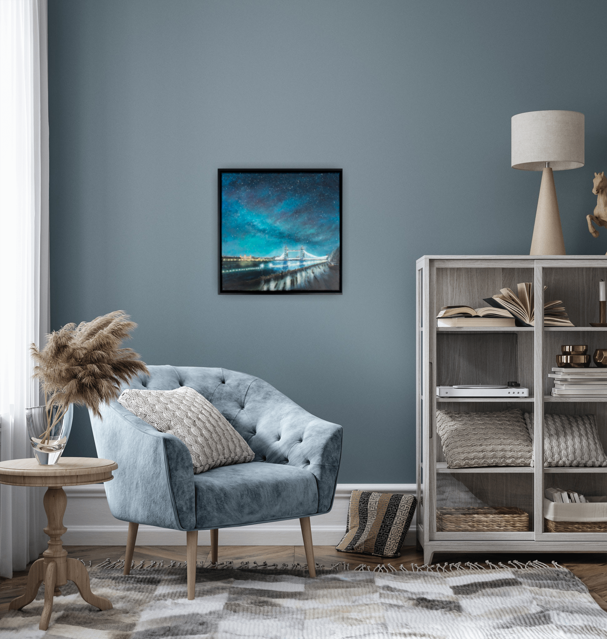 This evocative night-time painting captures a view along The Queen’s Walk in London, stretching across the Thames toward the glowing silhouettes of Tower Bridge and London Bridge. Against a deepening sky, commuters move steadily along the riverside path, their footsteps tracing the rhythm of the city’s pulse after dark.