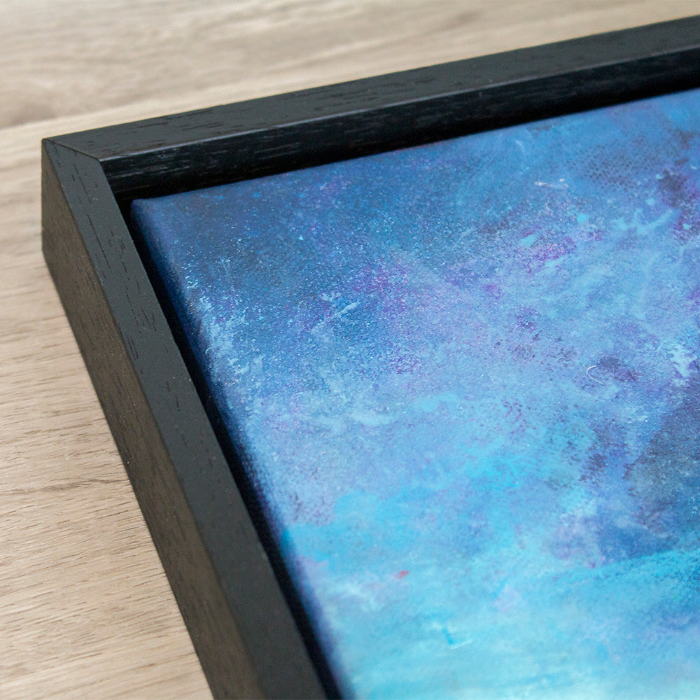 - Framed in a high quality black wooden floater frame.